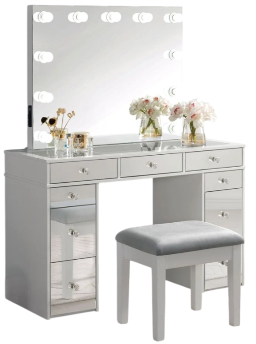 This vanity table will induce a sense of class to any bedroom. Lining up the central mirror are 11 bright bulbs, controlled by a switch on the right edge of the mirror. This also houses the USB and power outlet to charge your phone, tablet, or power your beauty tools.Read More