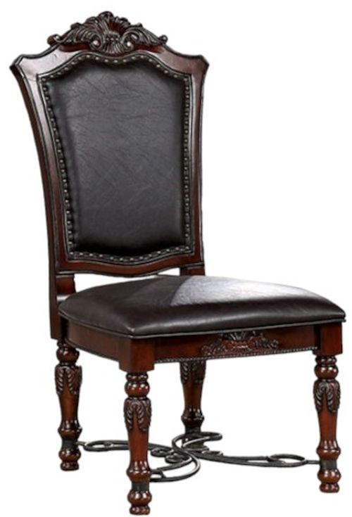 A perfect fit for those looking for a traditional piece, this dining set brings the right amount of grandiose. This chair has upholstered seat and back cushions with black leatherette and nailhead trim.Read More