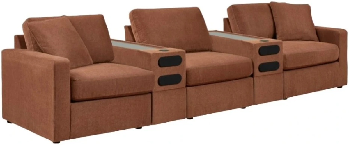 Includes 5 Modular Pieces: Left-arm facing corner chair, armless chair, 2 audio consoles with storage and right-arm facing corner chair