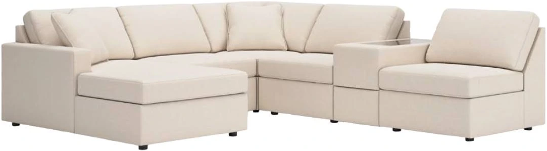 Includes 6 Modular Pieces: Left-arm facing corner chaise, 3 armless chairs, console with storage and wedge